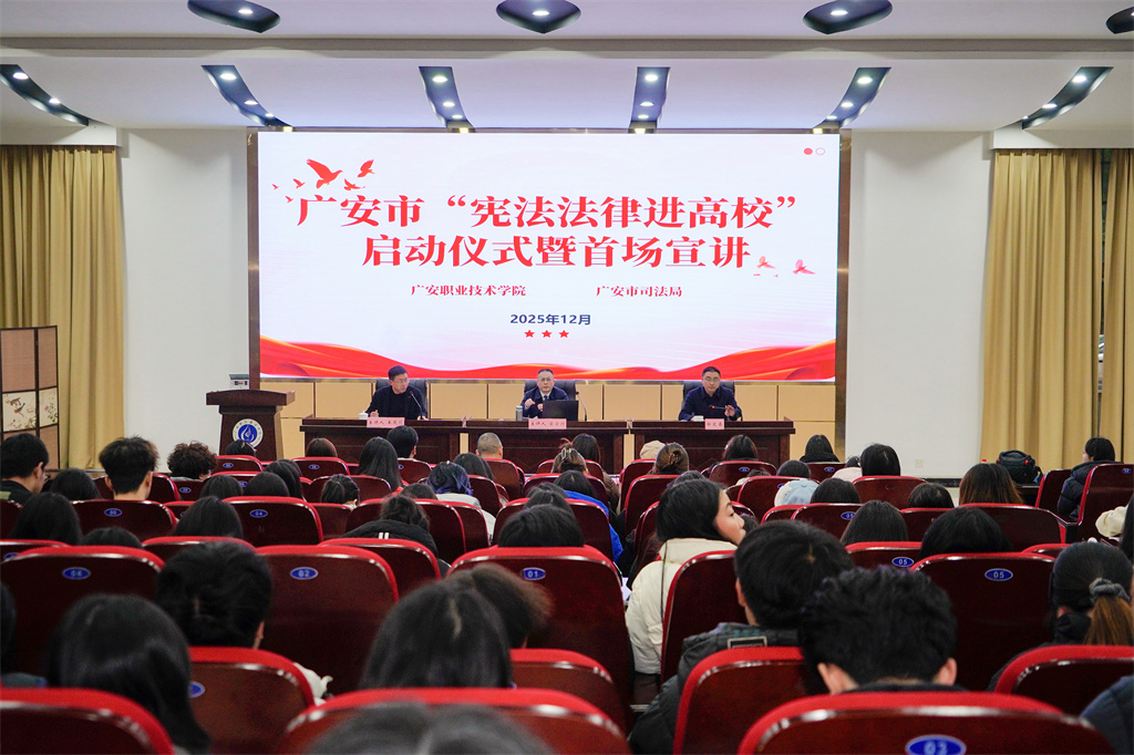 为进一步弘扬宪法精神,深植法治信仰,引领广大青年学生学思践悟习近平法治思想,12月3日,广安职业技术学院、广安市司法局联合开展“宪法法律进高校”活动。广安市司法局党组成员、副局长梁宁川为200余名师生带来了一场以“循法而行,让青春在法治的天空激情飞扬”为主题的学习贯彻习近平法治思想专题讲座。学校党委委员、组织部部长白文春致辞,并为梁宁川同志颁发了法治副校长荣誉证书。