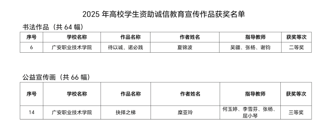 近日,四川省教育厅、中国人民银行四川省分行公布了2025年全省高校学生资助诚信教育宣传作品获奖名单,我校荣获优秀组织奖,建筑工程学院工程造价专业2022级1班夏锦波创作的书法作品《待以诚,诺必践》荣获二等奖,师范学院小学教育专业2023级3班糜亚玲创作的公益宣传画《抉择之梯》荣获三等奖。