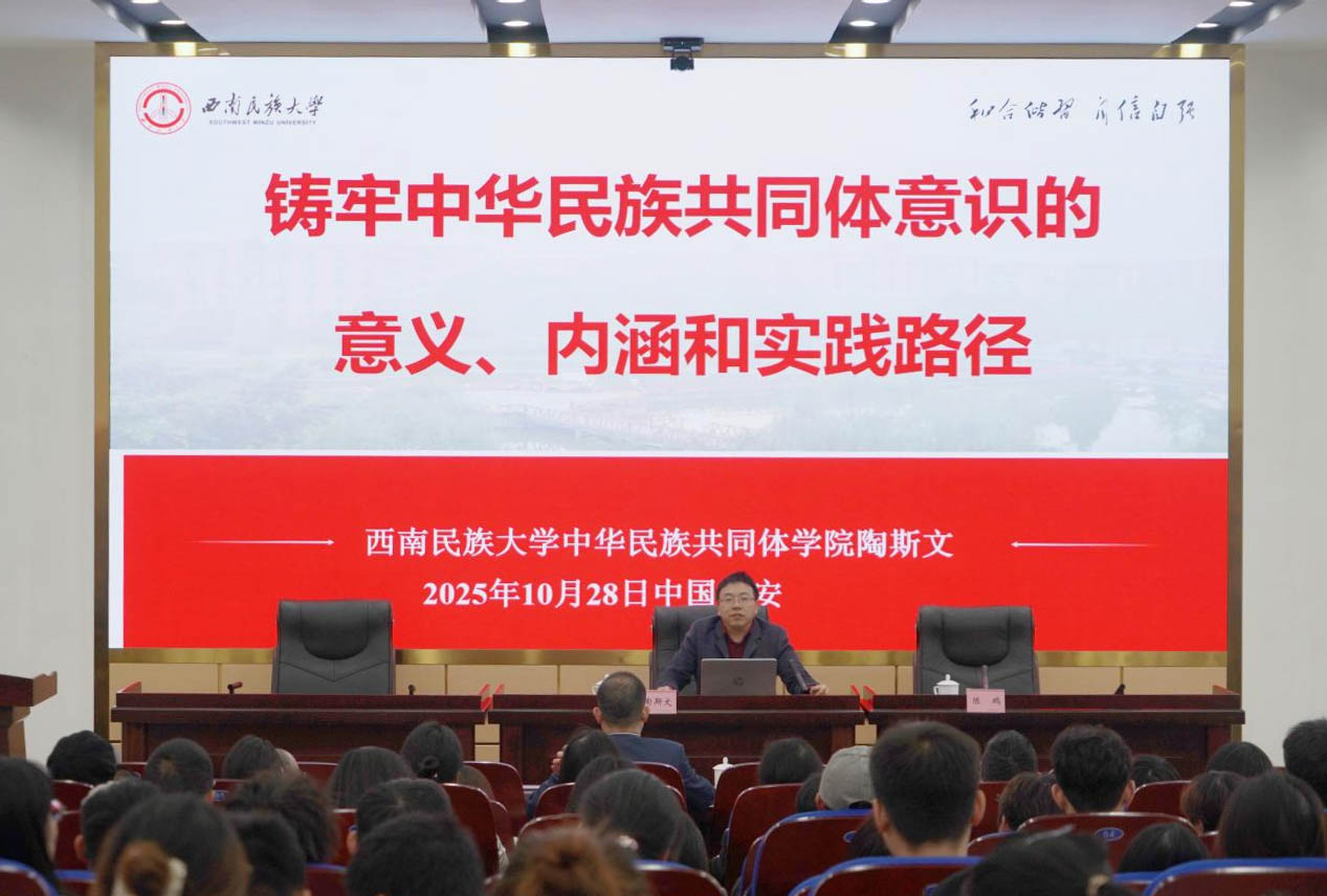 10月28日,由四川省民族宗教事务委员会、四川省教育厅、共青团四川省委主办的四川省铸牢中华民族共同体意识高校巡回宣讲活动在我校先圣厅举行。四川省铸牢中华民族共同体意识宣讲团成员、西南民族大学教授陶斯文作宣讲,学校党委副书记陈鹏主持宣讲活动。各党总支、直属党支部,马克思主义学院、学工部、团委等师生代表和全体辅导员240余人参加活动。
