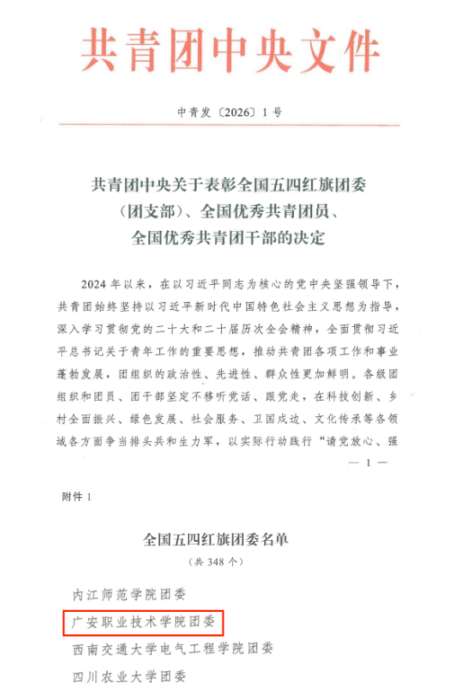 从“有形覆盖”到“有效引领”,从“被动参与”到“主动作为”,广安职院团委蹚出了一条地方高职院校共青团高质量发展的务实路径。此次荣获该项荣誉,既是对我们坚守初心、务实笃行的阶段性肯定,更是激励我们砥砺奋进、接续奋斗的鞭策。未来,校团委将继续在党委领导下,坚守为党育人初心,不断提升引领力、组织力、服务力,团结带领广大青年在推进中国式现代化的火热实践中,书写属于新时代技能人才的青春答卷。