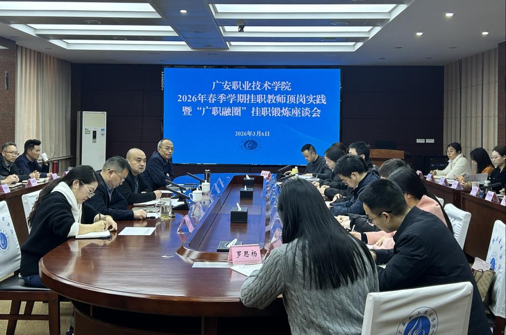3月6日下午,学校在春晖楼四楼会议室召开2026年春季学期教师顶岗实践锻炼和“广职融圈”赴重庆高职院校挂职锻炼教师座谈会。党委委员、副校长冉嘉洛主持会议并讲话,学校相关职能部门负责人、各二级学院院长,以及2025年秋季、2026年春季全体挂职锻炼教师参加会议。