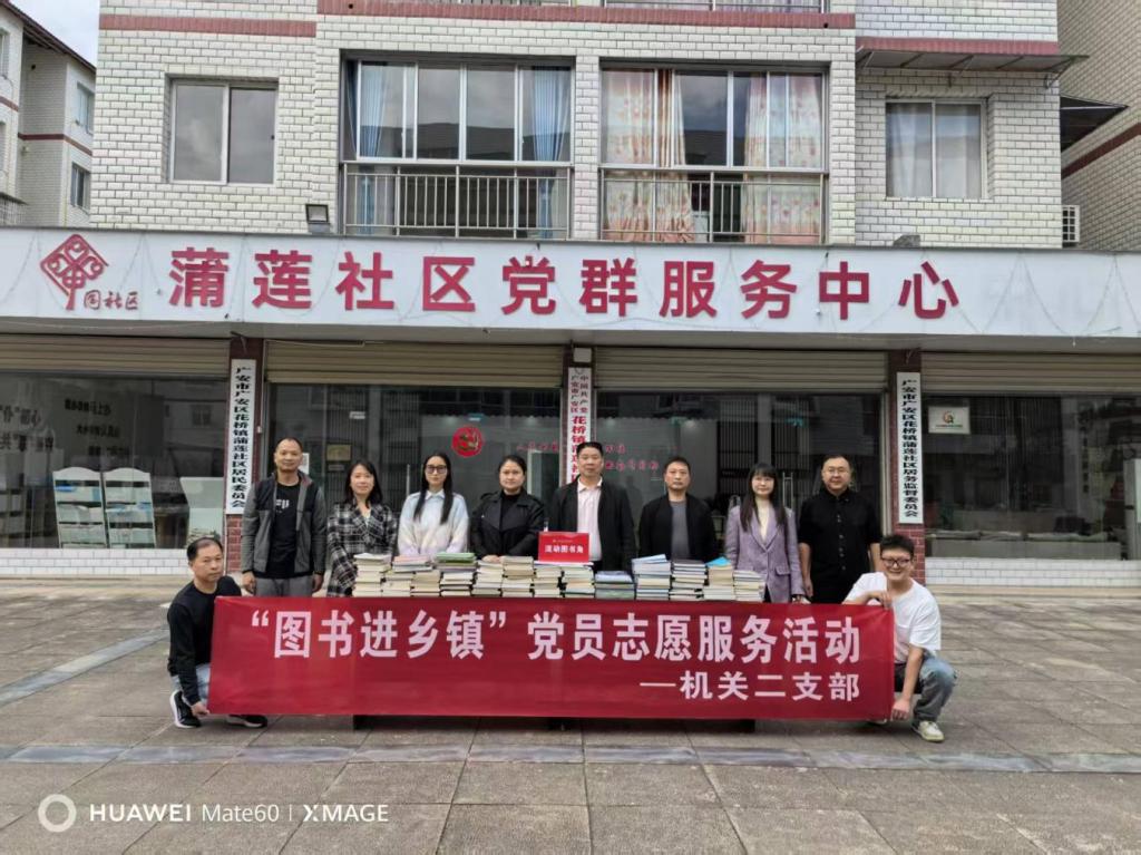 活动现场,大家分工明确、默契配合,一场“书香接力” 有条不紊地进行。蒲莲社区党委书记伍泽孝提前协调社区场地,为流动图书角的搭建做好准备工作,机关二支部党员代表与学校驻村教师一起,将150余本精心挑选的流通图书分类整理,既有适合成年人阅读的文学名著、生活技能手册,也有针对儿童的绘本故事、趣味科普读物。