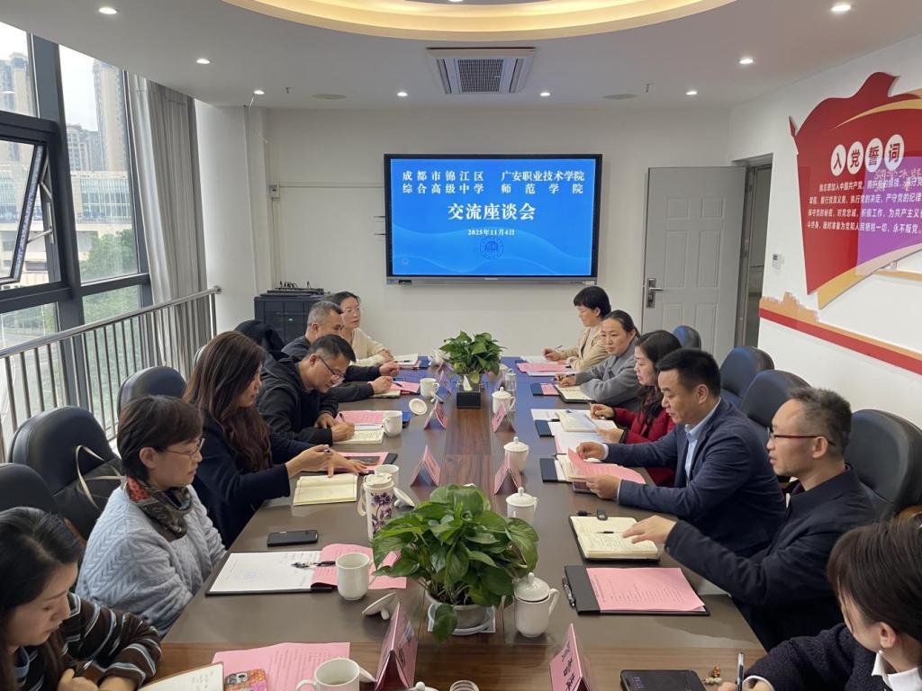 11月4日下午,成都市锦江区综合高级中学(成都现代职业技术学校)一行6人在副校长彭云强的带领下,到我院开展考察交流活动。双方围绕“中高职衔接五年贯通培养”合作事宜进行了深入座谈,共谋人才培养新路径。