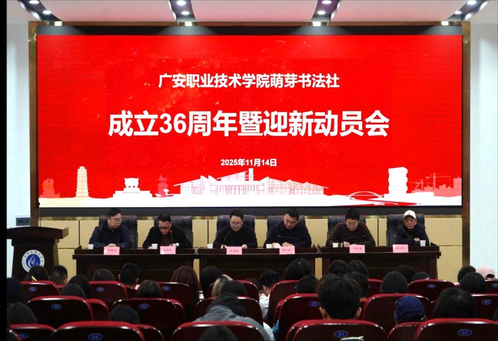11月4日下午,广安职业技术学院萌芽书法社成立36周年暨迎新动员大会在学校希贤厅举行。广安市文联党组成员、秘书长、市书法家协会主席周永生,四川省硬笔书法家协会副主席、广安市硬笔书法家协会主席龚建林莅临大会并讲话,学校团委书记周泽南出席会议并作动员讲话。贵州大学书法教师杨春光,广安市书法家协会副主席何金军,市硬笔书法家协会副主席董济侨、邹光明等到场指导,萌芽书法社历届校内外指导教师、全体社员以及学校社团联合会、其他社团代表参会,会议由广安市文艺评论家协会主席、艺术与设计学院院长王雪松主持。