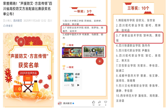 11月26日,由四川省性病艾滋病防治协会主办的2025年“声援防艾·方言传情”四川省高校防艾方言配音比赛获奖名单正式揭晓,医学院选送的两支队伍参赛作品在逾千件投稿作品中脱颖而出,经专家评审与网络投票得分,最终斩获一等奖、三等奖各一项。