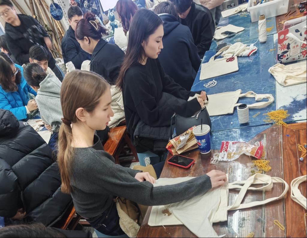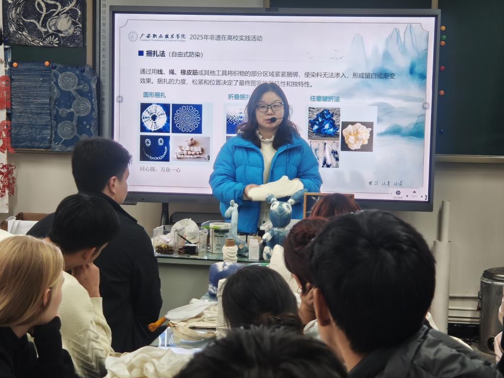 为深入弘扬中华优秀传统文化,促进校园国际文化交流,12月3日下午,红色文化研究中心联合艺术与设计学院、对外交流与合作处共同主办的“非遗焕新·青春共鸣”非遗在高校实践活动在红研中心多功能室、艺术与设计学院扎染工作坊成功举行。活动吸引了来自多个国家的留学生与中国学生社团骨干40余名代表共同参与。