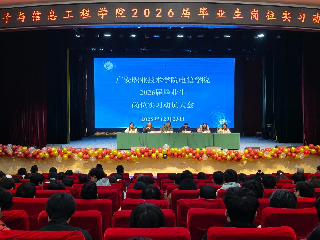 为深入贯彻教育部、省教育厅及学校关于提升实习质量的相关要求,进一步规范和加强学生岗位实习工作,提高技术技能人才培养水平,推动毕业生实习与就业工作有序开展,12月23日下午,电信学院在杏坛召开2026届毕业生岗位实习动员大会。学院党总支书记喻忠、院长王凤领、教学副院长赵勇,教学科、学生科、综合办、各专业负责人、实习班级全体学生及相关辅导员参加会议。会议由教学副院长赵勇主持。