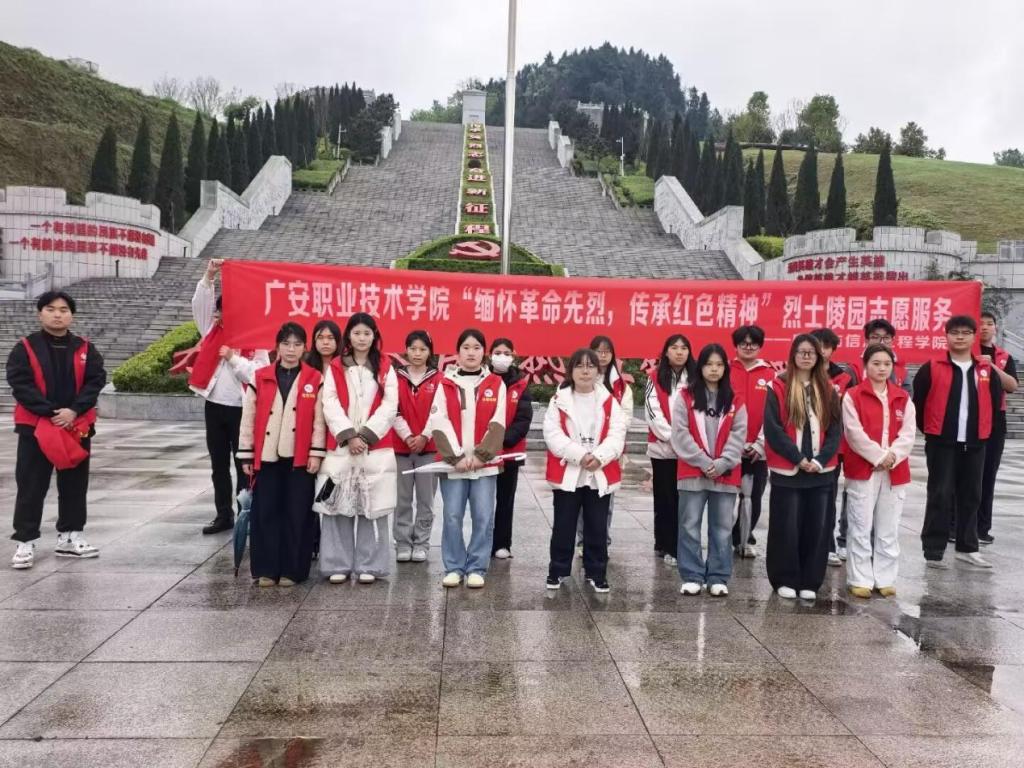 为深入开展红色教育实践,缅怀革命先烈、传承红色基因,引导青年大学生铭记革命历史、传承英烈精神,展示新时代青年学子的责任担当与良好风貌。3月21日下午,广安职业技术学院电信学院组织20名志愿者赴广安市烈士陵园开展“缅怀革命先烈·传承红色精神”主题志愿服务活动。