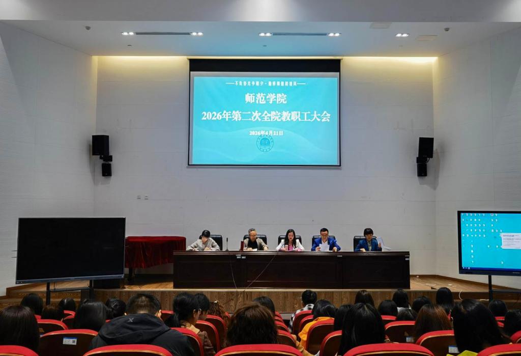 为深入学习贯彻上级决策部署,进一步强化师德师风建设,系统部署近期各项重点工作,4月21日下午,师范学院在岳秀楼翔凤厅召开了第二次全院教职工大会。会议由院长杨英主持。